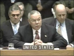Secretary of State Colin Powell addressed the United Nations on Feb. 5. 2003, citing satellite photos which supposedly proved that Iraq had WMD, but the evidence proved bogus. CIA Director George Tenet is behind Powell to the left.