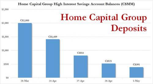 As discussed first thing this morning, the fate of Canada’s largest alternative mortgage lender, Home Capital Group, appears to have been decided over the weekend, when in the span of just one week, over 70% of the company’s deposit base had been withdrawn, effectively mothballing the business, leaving just a sale or liquidation as the two possible outcomes even as a $2 billion emergency line of credit keeps the company afloat, at least until HCG’s $12.8 billion in GICS mature some time over the next 30 to 60 days.