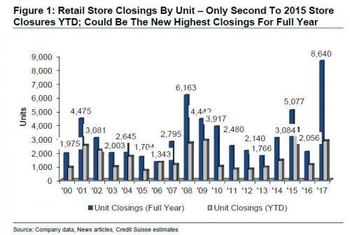 While the shuttering of retail stores has been a frequent topic on this website, most recently in the context of the next “big short”, namely the ongoing deterioration in the mall REITs and associated Commercial Mortgage-Backed Securities and CDS, here is a stunning fact from Credit Suisse:“Barely a quarter into 2017, year-to-date retail store closings have already surpassed those of 2008.”