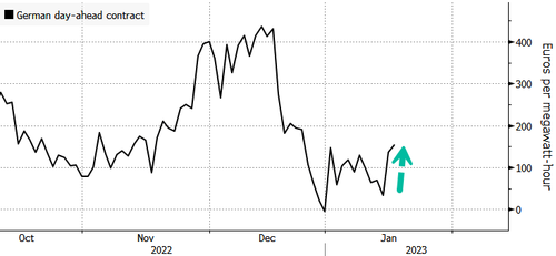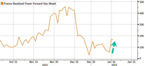 French day-ahead power prices jumped to 135 euros a megawatt-hour, a 42% increase versus the rolling two-week average. The cause of the price spike is a surge in heating demand and delays in restarting nuclear plants.