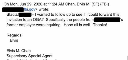 8.On June 29th, 2020, San Francisco FBI agent Elvis Chan wrote to pair of Twitter execs asking if he could invite an “OGA” to an upcoming conference: