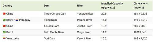 At the top of the list is China’s Three Gorges Dam, which opened in 2003. It has an installed capacity of 22.5 gigawatts (GW), which is close to double the second-place Itaipu Dam.