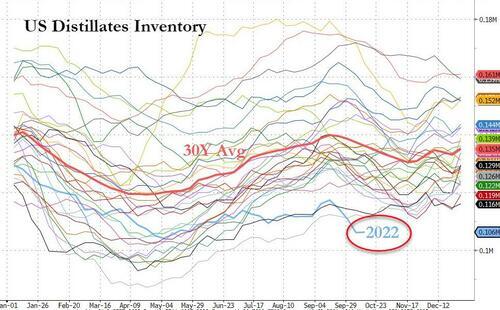 The latest EIA data shows there are only 25 days of diesel supply, the lowest since 2008; and while inventories are record low, the four-week rolling average of distillates supplied – a proxy for demand – rose to its highest seasonal level since 2007.