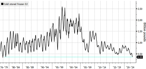 First, let’s begin with US stockpiles of cold-stored orange juice plunged by 43% in September from a year earlier — the lowest level since 1977, according to the latest US Department of Agriculture data.