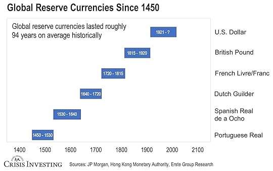 But the U.S. Dollar hasn’t always held the throne. If you look at the graph below, you’ll see that the history of the world’s reserve currencies began with the Portuguese Real in 1450 (and has continuously shifted from one currency to another since then).