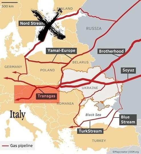 It’s important to note most of the Russian NatGas delivered to Italy flows through Ukraine via the Trans Austria Gas Pipeline to Tarvisio in northern Italy on the border with Austria. Before Russia invaded Ukraine, Italy imported 95% of its NatGas, of which 45% came from Russia.