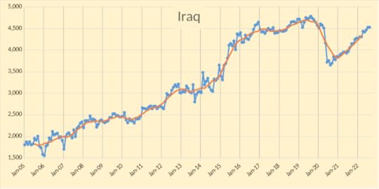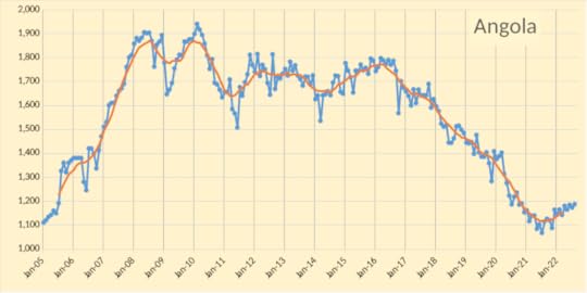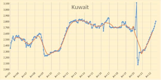 The OPEC Monthly Oil Market Report (MOMR) for September 2022 was published recently. The last month reported in most of the OPEC charts that follow is August 2022 and output reported for OPEC nations is crude oil output in thousands of barrels per day (kb/d). In most of the OPEC charts that follow the blue line is monthly output and the red line is the centered twelve month average (CTMA) output.