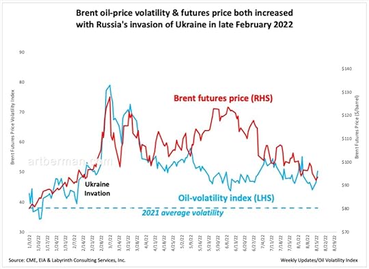 Figure 1 shows Brent futures price (red), futures price volatility (blue) and 2021 average price volatility (dashed blue). Both price and price volatility increased after Russia’s invasion of Ukraine in late February of 2022. Volatility decreased in April but has not returned to the pre-invasion 2021 volatility average.
