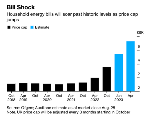 All the chatter today among British people is energy regulator Ofgem’s rise in the cap on power bills to a record £3,549 ($4,189) beginning Oct. 1 from £1,971 ($2,330) at present. That cap is expected to rise to £5,439 ($6,427) by January and £7,272 ($8,594) by spring — all due to skyrocketing wholesale NatGas and electricity prices caused by declining Russian energy supplies to Europe, made worse by Western sanctions that have backfired.