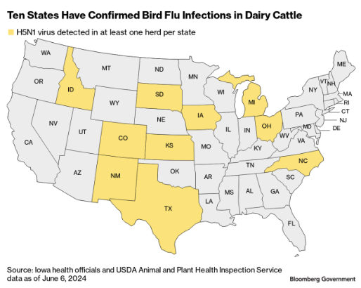 The latest US Department of Agriculture data shows bird flu has infected at least 80 dairy herds across ten states. There are growing concerns about rising cow mortalities from the virus and the risk of farmers culling cows to stop the spread. This could ignite economic stress across the farm belt and unleash a supply shock.