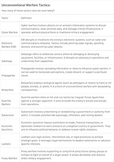 Consider what’s happening both at home and abroad, then look at the summary of unconventional warfare tactics below…