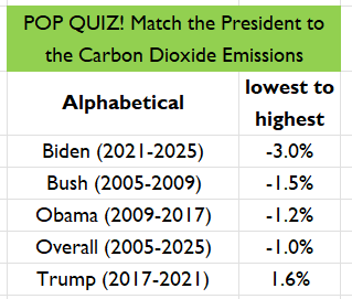 Before reading on, please provide your best guesses matching the presidential administration with with the annual rate of carbon dioxide emissions reductions over each president’s term in office — dating to 2005, which is the baseline year commonly used to assess U.S. emissions reduction progress.