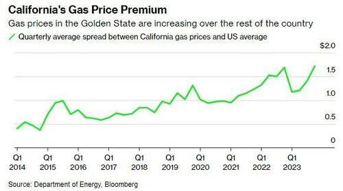 In the last quarter of 2023, drivers in California faced an average gasoline price of $4.94 per gallon, surpassing the national average by approximately $1.72, marking the highest recorded quarterly difference, as per Bloomberg’s compiled data.