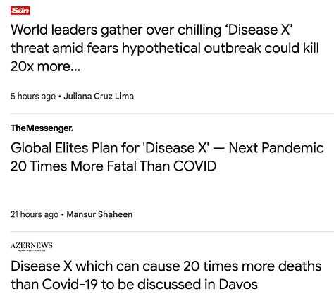 It is Davos (World Economic Forum) week and the MSM hysterical propaganda push from the globalists regarding “disease X” is in full swing. Just take a gander at a few of the Corporate Mockingbird Media headlines today.