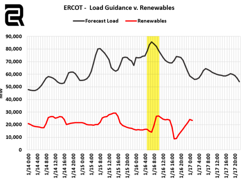 ERCOT’s current forecast run shows extreme demand conditions starting on Tuesday, January 16, 2024. That includes a projected peak load of 85,587 MW at 7 AM that morning. However, renewable generation from wind and solar are expected to help out as demand pushes to a seasonal record, with early morning wind + solar contribution 14,137 MW.
