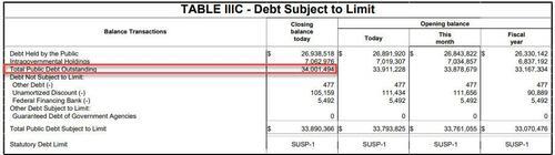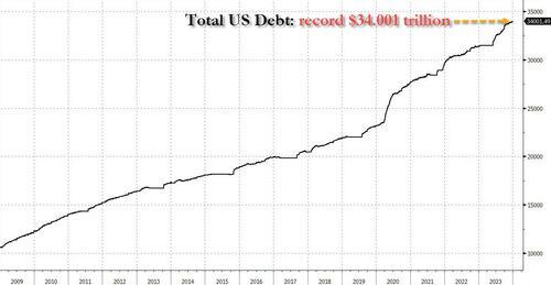 The US Treasury has a morbid habit of revealing big, round numbers of debt around major calendar milestones, and the new 2024 year was no different because according to the latest Treasury Daily Statement published after the close today and reflecting the US Treasury’s financial statements as of Dec 29, 2023, total US debt as of the end of the year was – drumroll – just over $34 trillion for the first time ever, or $34,001,493,655,565.48 to be precise.