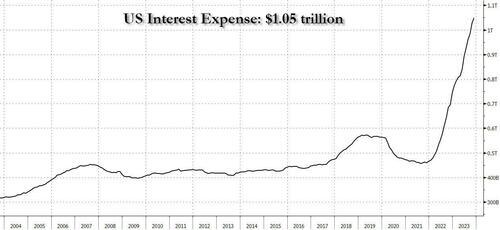 … but since there is no way to reverse the catastrophic outcome, there is no point in even talking about it. At best, one may only prepare for the inevitable hyperinflationary outcome, which would be good news to what is now over $1 trillion in interest expense: after all, someone has to devalue the currency all that interest is payable in.