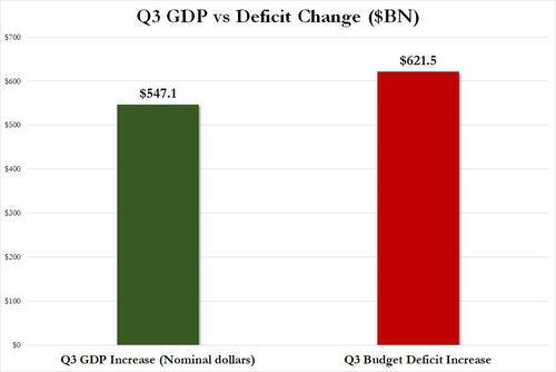 And since there is no longer a way out, we may as well joke about it so consider this: in the third quarter when US GDP supposedly grew at a 4.9% annualized rate – hardly the stuff of recessions – rising $547 billion in nominal (not real) dollars, the US budget deficit increased by a whopping $622 billion.
