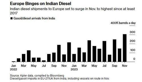 Europe’s imports of diesel from India, one of the biggest buyers of Russian crude, are on course to soar to 305,000 barrels a day, the most since at least January 2017, the latest data market-intelligence firm Kpler show.