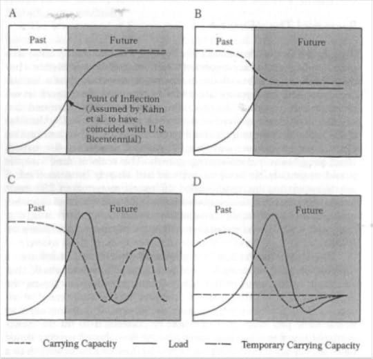 The following graph from Catton’s text provides four possible growth scenarios, with Panel D being the most likely for humanity. As he explains “’carrying capacity’ has been represented by two different curves. A major fraction of the recent, apparently high carrying capacity for human high-energy living must be attributed to temporary resources — i.e., non-renewable fossil acreage, the earth’s savings deposits. In Panel D, it is optimistically assumed that the component of carrying capacity based on renewable resources has remained stable so far. But it is recognized that serious overshoot, induced by temporarily high composite carrying capacity, will at least temporarily undermine even the sustainable component.” (p. 253)