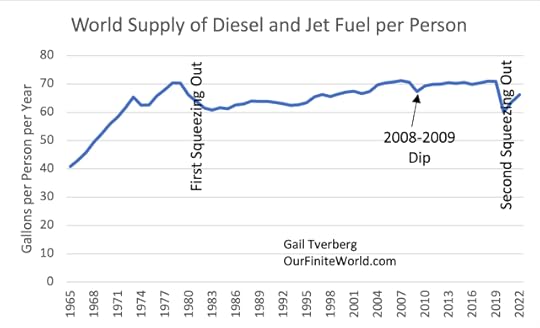 Recently, I explained the key role played by diesel and jet fuel. In this post, I try to explain the energy bottleneck the world is facing because of an inadequate supply of these types of fuels, and the effects such a bottleneck may have. The world’s self-organizing economy tends to squeeze out what it considers non-essential parts when bottlenecks are hit. Strangely, it appears to me that some central governments may be squeezed out. Countries that are rich enough to have big pension programs for their citizens seem to be especially vulnerable to having their governments collapse.