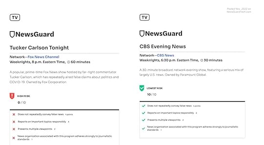 On September 7, 2021, the U.S. Department of Defense gave an award of $749,387 to Newsguard Technologies, a private service that scores media outlets on “reliability” and “trust.” According to the suit, roughly 40,000 subscribers buy Newsguard subscriptions, getting in return a system of “Nutrition Labels” supposedly emphasizing “safe” content. Importantly, Newsguard’s customers include universities and libraries, whose users are presented with labels warning you that CBS is great and Tucker Carlson is dangerous: