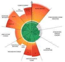Me: There are a number of planetary boundaries that have been broached because of our ecological overshoot. They all pose an existential risk and a number have been identified as being worse off than carbon emissions…the focus needs to be on all of them.