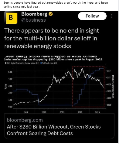 Me: Just as fracking was, the profit-makers/-takers have spun several narratives to entice investments — both capital and retail. Believers have, once again, trusted the untrustworthy and fallen for the con failing to understand that our energy-intensive living has never been sustainable on a finite planet regardless of our ingenuity and technological prowess. All we’re doing by chasing the unicorn of ‘renewables’ is expediting our journey over the energy cliff while contributing evermore to our ecological overshoot. Sad on so many levels.
