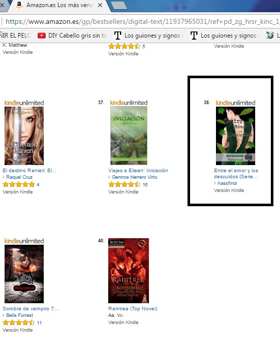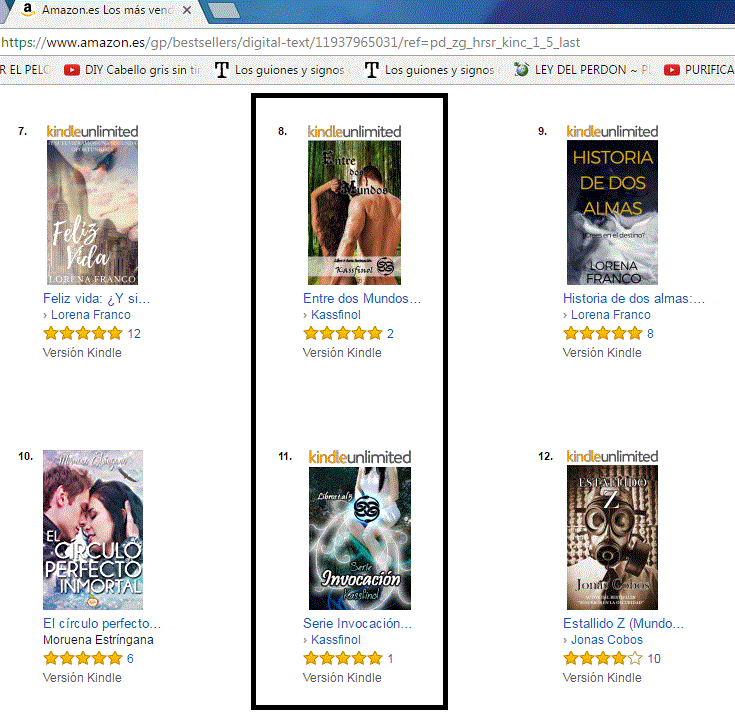 Estas cosas me dan mucha felicidad. Hace años me era infinitamente dificil vender libros en Amazon.es ya que todas mis ventas provenían de Amazon.com pero desde hace unos cinco meses la situación ha cambiado. Y gracias a Dios para mejor. Hay semanas en que han subido y bajado, pero que HOY de 100 puestos, mis libros acaparen 11 lugares, esto es gratificante. Estar entre tus autoras favoritas es alucinante. Y que ustedes, los lectores, me tengan entre estos puestos de "Romance Paranormal" me alegra un mundo. Gracias.