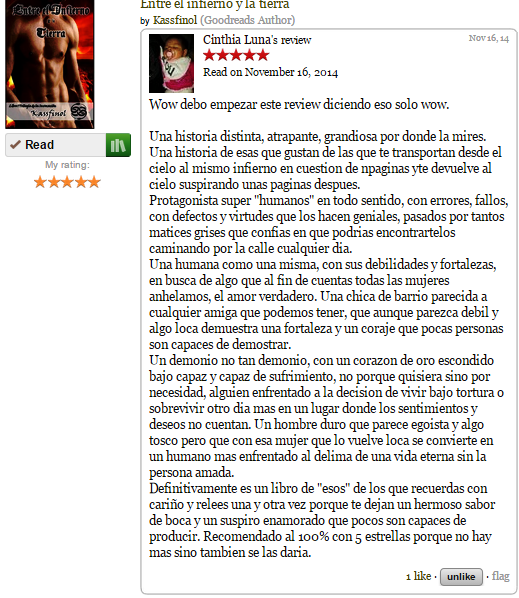 Estoy muy agradecida porque se tomen el tiempo y me den la oportunidad de entrar en sus vidas a través de mis libros. Muchas gracias. Aquí les dejo algunas nuevas reseñas, si quieres leer más puedes visitar mi página en Goodreads Hay más de 100 reseñas con una puntuación general de 4.56