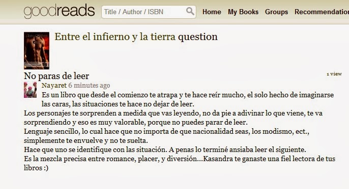 Libro entre el infierno y la tierra KassfinolEstoy muy contenta al ver este lindo comentario. Vale la pena dejar de hacer muchas cosas que hace la gente normal por tener tiempo para escribir y contar mis historias. ¡Gracias por valorar y apreciar lo que hago!Este libro podrán conseguirlo en cualquiera de los canales de venta tanto en #físico como en #kindle o #pdf aquí ---> www.kassfinol.com/tienda ¡Estoy segura que les gustará!