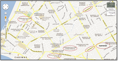 A propósito de que el relato I DE CONVIRTIÉNDOME EN ZOMBI será publicado el 30 de este mes, aquí les dejo el mapa, donde ocurre la historia para que al leerla entiendan y se ubiquen bien. Lo que está encerrado en circulo son los lugares que se mencionan en el relato. EL SUPERMERCADO, No sale en el mapa pero esa es la ubicación real, Y obviamente no coloqué el nombre. =P