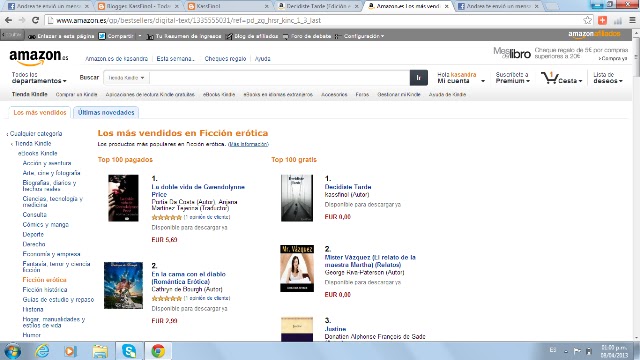 Decidiste tarde está de 1ro en amazon.es. Aqui les dejo los link de descargas: Amazon.com---> http://www.amazon.com/Decidiste-Tarde-Spanish-Edition-ebook/dp/B0099554E4/ref=sr_1_2_bnp_1_kin?ie=UTF8&qid=1365297766&sr=8-2&keywords=kassfinol y Amazon.es ----> http://www.amazon.es/Decidiste-Tarde-ebook/dp/B0099554E4/ref=sr_1_4_title_1_kin?ie=UTF8&qid=1365390803&sr=8-4&keywords=kassfinol