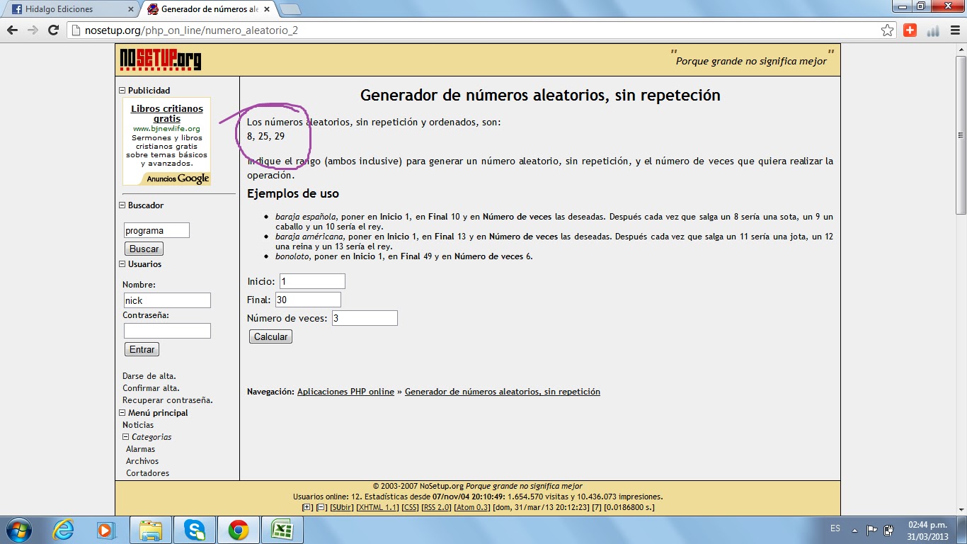Disculpen la imagen jajaja sé que el circulo está horrible jajaja =D por favor envíenme un correo a Kassfinol@gmail.com para reclamar su libro. =) Utilicé ese generador porque era muy poco probable que utilizara números muy cerca, menos mal que ningún GANADOR SALIÓ REPETIDO =D