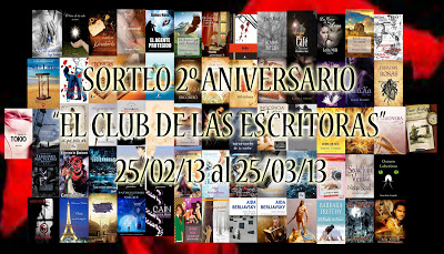 Buenas tardes queridos lectores, por motivo de la celebración del magnifico CLUB DE LAS ESCRITORAS se estará realizando un gran sorteo de libros, las bases son muy fáciles y hay mas de 50 libros sorteándose. Aquí les dejo las bases y los lotes de libros... MIS LIBROS ESTÁN EN EL LOTE 19 CON LA ESCRITORA SHEINA LEONI Y EN EL LOTE 20 CON LA ESCRITORA DIANA LINARES. ---> http://elclubdelasescritoras.blogspot.com/2013/02/segundo-aniversario-del-club-de-las.html