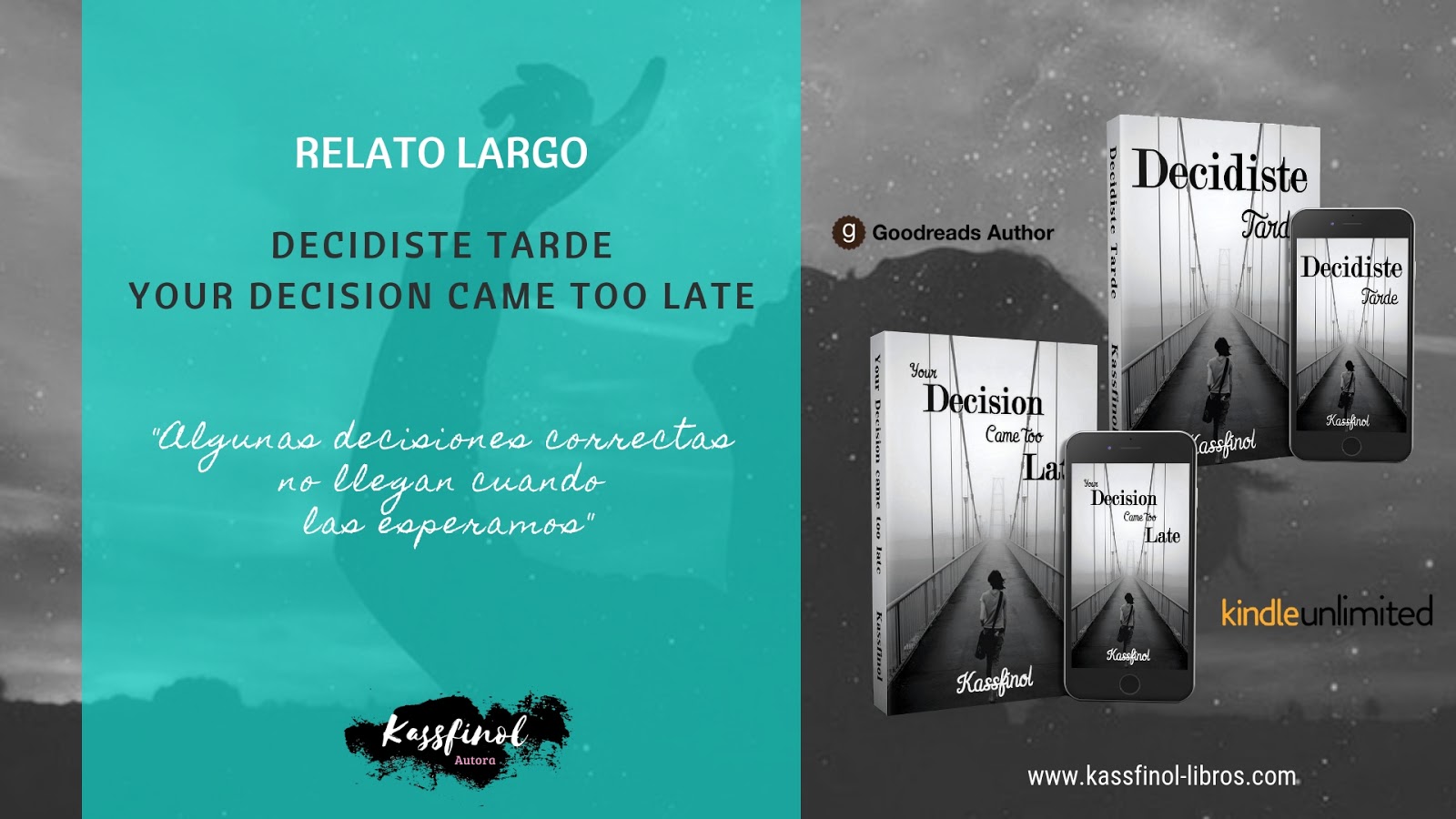 Sus reseñas pueden leerlas en: www.kassfinol-libros.com/resenas/¿No tienes Kindle? Aquí te digo cómo leer los libros en cualquier dispositivo: http://www.kassfinol-libros.com/como-leer-libros-de-amazon…/Libro en español: myBook.to/decidistetarde Libro en Inglés: myBook.to/yourdecisioncametoolate