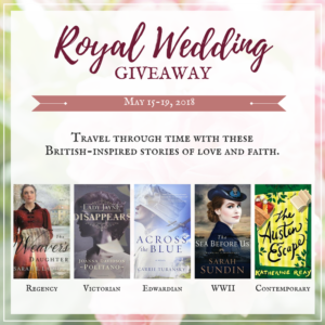 Welcome to the Royal Wedding Giveaway. In honor of the royal wedding, some friends and I got together to offer some British-inspired fun. You’ll love these stories spanning the centuries by Sarah Ladd, Joanne Politano, Carrie Turansky, Sarah Sundin and… well, me. Please click through to the giveaway — sign up for any newsletters you’d like and current subscribers to my newsletter who click through will get an entry as well. You don’t have to be new to the list to have a chance at some wonderful reading.