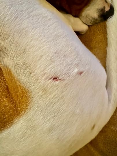 It wasn’t until we got home that I found the small puncture wound midway down his thigh – a clear indication to me that my sweet, shy boy was clearly trying to get away from his attacker. It’s a minor wound considering how much damage a dog bite can do. I’ve got it cleaned and treated as best I can, so I’ll be over here hoping it doesn’t go infected.