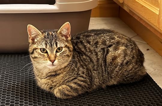 Cordelia (Cordy), is a brown tabby and about 3 months old according to the shelter staff. Her name derives from her being attractive, popular, and thus far, entirely untouchable. Her modus operandi for the most part is to burst out of hiding for a mouthful of food or a drink and then retreating immediately back to her spot. I get it. It’s a process.