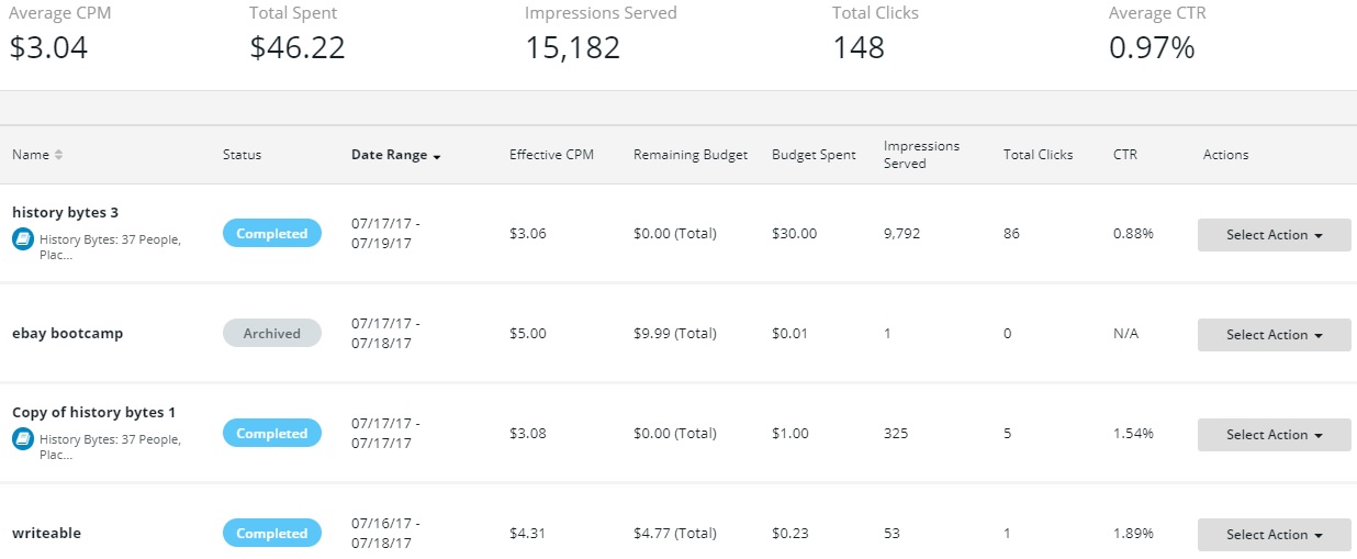 Here's a chart showing the results of ad campaigns for my two most popular books - History Bytes and Shot All to Hell. If you look closely you will see three separate campaigns have gotten over one million impressions. Better yet, they have made some great sales.