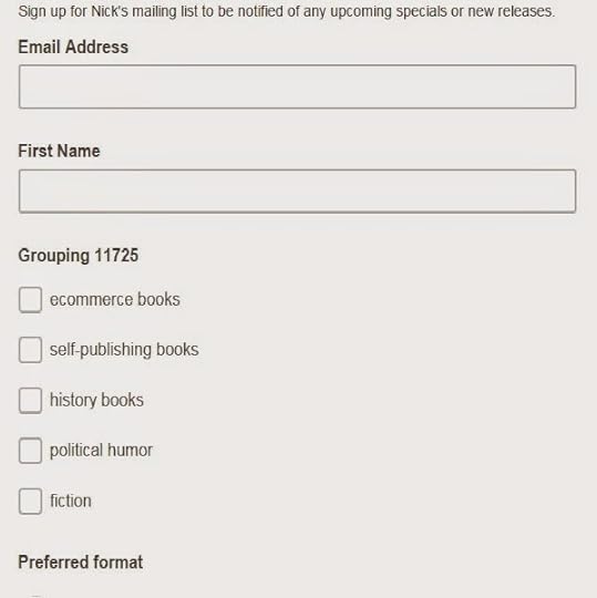 If you look where it says Grouping 11725, you can see the different categories. By doing this readers can choose what they want to be notified about. Readers interested in only my ecommerce or history books can choose just those categories. When I send out offers about my self-publishing books or political humor works they won't be bothered.