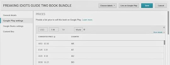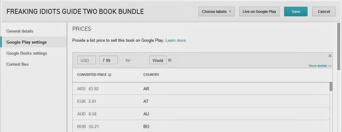Click on Google Play Settings in the left hand column. The first thing you’re asked is to add a new price. Click on Add a new price. Type in the currency your book is priced in (For example US Dollars is USD). In the next box you need to type in the price (example 3.99). Finally, you’re asked to choose the location for that price. To make it easy, use “World.” If you have different prices for different locations, you would need to add each of them separately. Follow through the rest of the prompts on this page. If you are unsure how to answer hover your mouse over the question mark and it will guide you through answering the question. Click on save at the top of the page.
