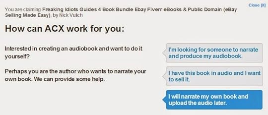 The choices are: I’m looking for someone to narrate and produce my audio book.I have this book in audio and I want to sell it. I will narrate my own book and upload it later.