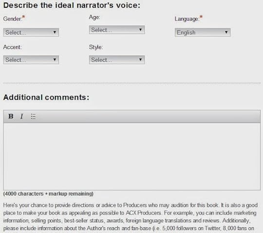 Use the additional comments section to list more information about your book, or about what you are looking for in a narrator. When I listed my books I talked about their ranking on Amazon, how many books I was selling monthly and weekly, and how I was promoting them. Producers told me this information was a big help to them in choosing my books because it helped them decide if the project would pay off for them or not.