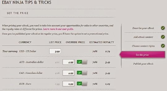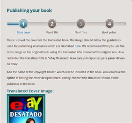 Upload your translated book cover. To upload your new cover click on the choose file box, and select your cover file. Ensure your name, and the name of your cover designer is correct.Check the word file. The translated word file is preloaded into the system by Babelcube. You can download a copy to your computer by selecting here, right after where it says download the file. As long as the first ten pages check out ok, I normally skip reviewing the entire document, and just assume everything is ok. If you make changes to the file, upload the revised document where it allows you to choose the new file to upload. Select next step at the bottom of the page to proceed to the next section.Review the final document. Check the I have reviewed this manuscript box to approve the document, and select next step to proceed to the final section.Set your book price. Babelcube lets you set the price of your book between 99¢ and $39.99. For best results they suggest you price your book between $2.99 and $9.99, which is in line with Amazon’s sweet spot for pricing.