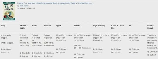 I list my books on Amazon, Barnes & Noble, and Kobo for myself so I choose to opt out of those three programs. This way I receive payment directly from both sites, and don’t have to pay a commission on those sales to Smashwords. Others authors prefer the convenience of doing it all through Smashwords and just having one distributor. You can always change your distribution options later, if you decide to publish to those channels on your own. I did this with Kobo when I discovered how easy it was to use their Writing Lifeinterface.