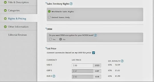 The next page asks for information on rights and pricing. Depending upon the rights you own select World sales rights or United States only. DRM lets you choose whether you want DRM encryption set up for your book. Finally, select your list price for the United States and the United Kingdom. When you are done entering this information click save and next.