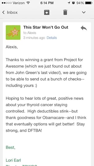Say what you want about John Green and his writing, but I just got some of the best news ever because of him. If it wasn’t for me picking up The Fault In Our Stars, reading Hazels diagnosis and thinking “holy shit that was almost my exact situation” I wouldn’t have found out about This Star Won’t Go Out. And I wouldn’t have learned about their financial assistance program. A few months back I got a routine test that I’ve had plenty of times before but with my new insurance the shots I needed ended up costing me over $2,400. TSWGO is reimbursing me for almost all of it. I’m literally sobbing from happiness. I’m so grateful for John, the Earl family, and anyone involved in TSWGO and Project For Awesome. This is amazing.