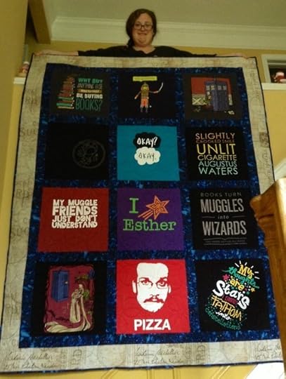 Finally finished my Nerdfighter t-shirt quilt!!! I’m so happy with how it turned out!! No one really gets all the nerdy stuff but I know and nerd fighters will know and that’s all that matters to me!! The 2nd one down on the left is DFTBA in galifrey, sadly the camera couldn’t pick it up. I thought the constellation fabric was fitting, and I loved the handwritten-letter print too much not to have it! So grateful to everyone who helped me with this project and to everyone who taught me how to make it! DFTBA