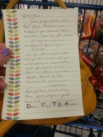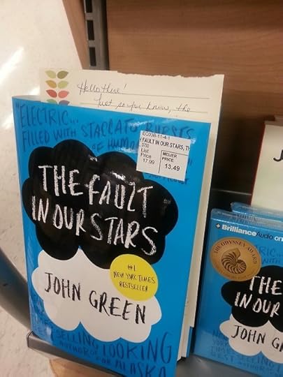 I was in the grocery store and spotted some copies of The Fault in Our Stars and decided that one of them needed a nerdfighter note. I hastily scribbled a note to leave, set it up so it’s noticeable by a someone interested in the book, and set off to check out the rest of the store.